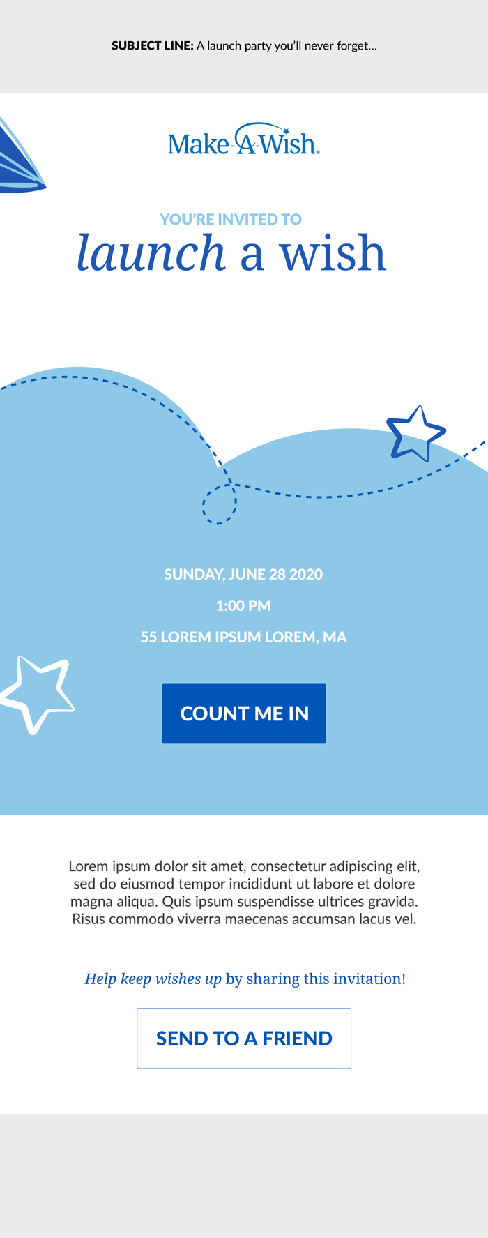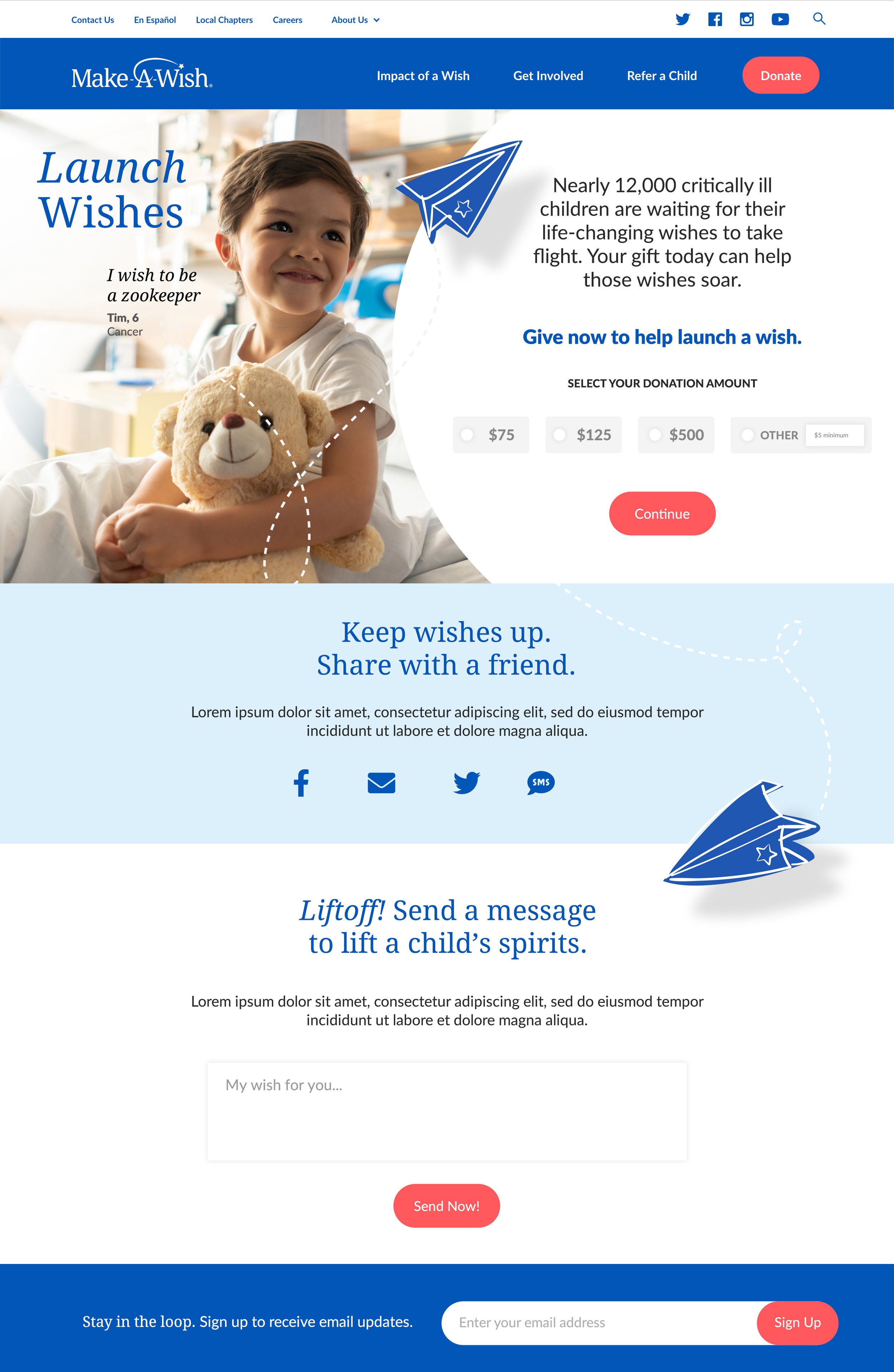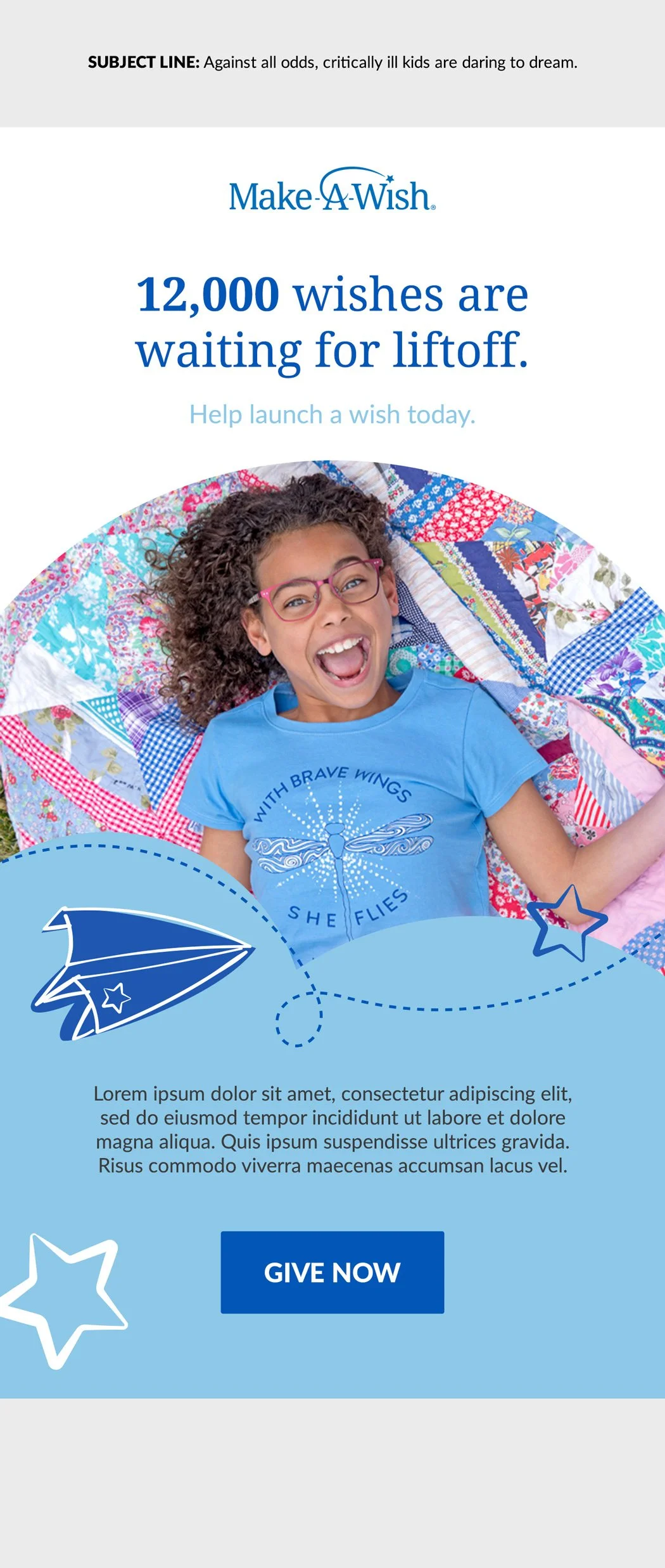 Each year, Make-A-Wish® grants 15,000 of these wishes. The rest remain, waiting to be launched. When a child dares to dream, you can be the difference between their wish falling or soaring. By helping launch a wish, you can give a child a boundlessly uplifting experience that offers a lifetime of hope, strength and joy.